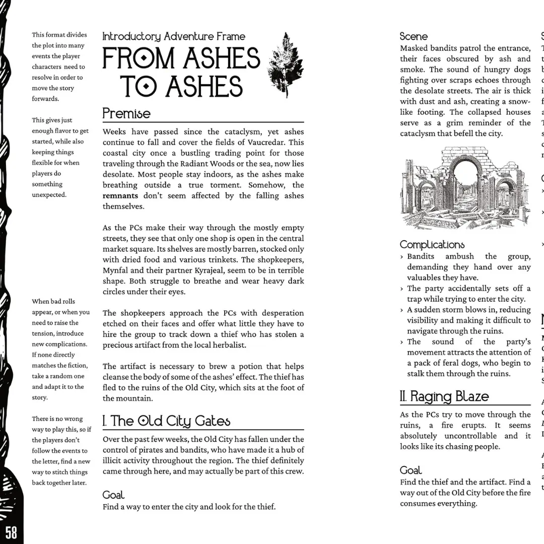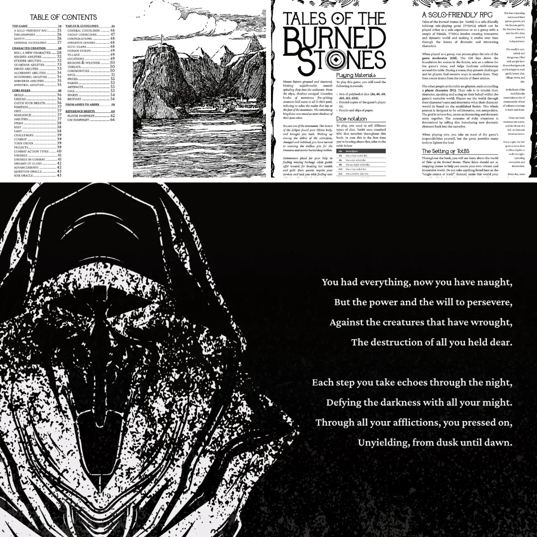 Tales of the Burned Stones is a free and solo-friendly dark-fantasy role-playing game of journeying and dungeon delving. In this game inspired by Diablo, The Witcher, and The Warded Man, players assume the roles of raiders and treasure hunters who are brave and foolish enough to delve into the derelict kingdom, located next to the demonic-controlled lands of Mount Baram, in search of stories, mementos, wealth, and lost artifacts.