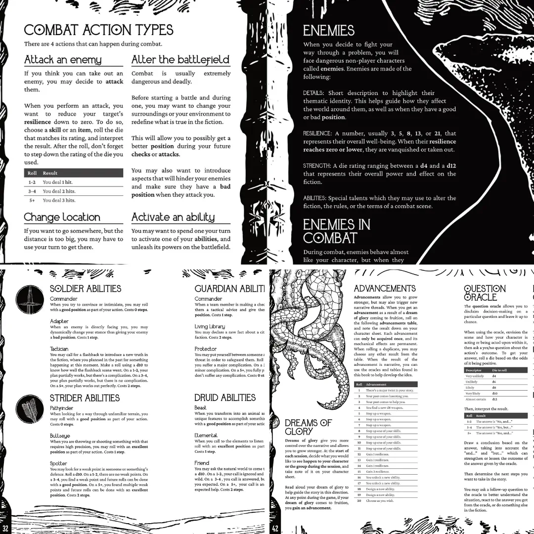 Numerous subsystems to handle fictional positioning, items, looting, long-term projects, challenges, combat, travel, and dungeon crawl, and more.